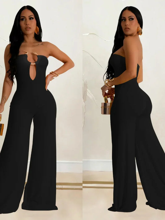 Women One Piece Sexy Jumpsuits Solid Slim Fit Strapless Sleeveless Tight Waist Wide Leg Long Pants Overalls Hip Wrap Rompers