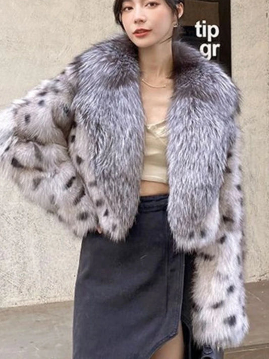 Women Winter Faux Silver Fox Fur Coat Leopard Pattern Imitation Mink Fur Jacket with Big Fur Collar Parka Cardigan Flocking Tops