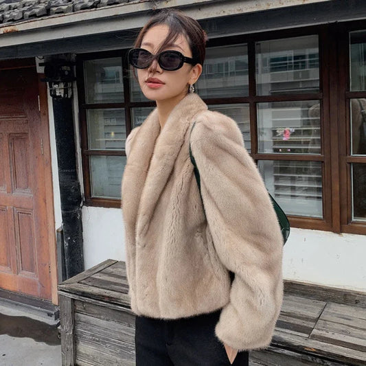 Women's Environment-Friendly Mink Fur Coat, Female Short Temperamental Vintage Outwear, Casual V-neck Coat, Winter Fashion