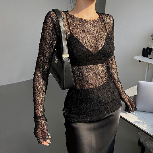Women's Sexy Lace Tops Long Sleeve Casual Elegant Blouses Shirts,Camisole Mesh Fitted Top Solid & Floral Tee Shirts