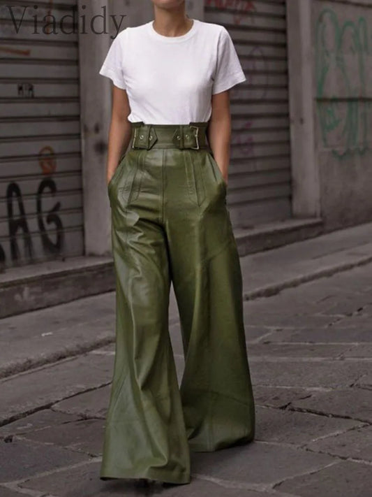 Women's Sexy Solid Color High Waist Belted Wide Leg PU Pants