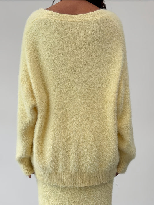 Women's Solid Color Casual V-Neck Long Sleeve Tunic and Fishtail Skirt Two-Piece Set