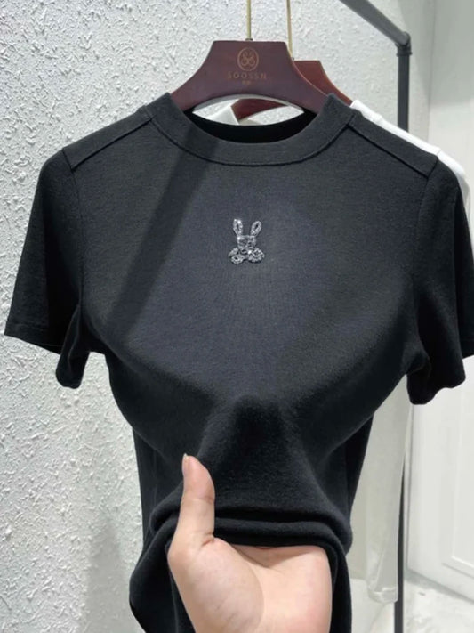 Women's Short Sleeved T-shirt Summer New Sparkling Diamond Star Rabbit Fashion High Elastic Soft Versatile Oversized Top