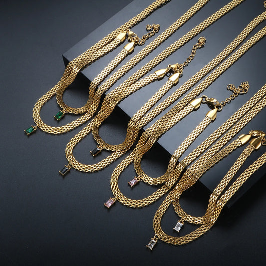 ZMFashion Retro Mesh Jewelry Set Colorful Rectangle Zircon Choker Chain Popular Necklace Bracelet For Women Men Stainless Steel