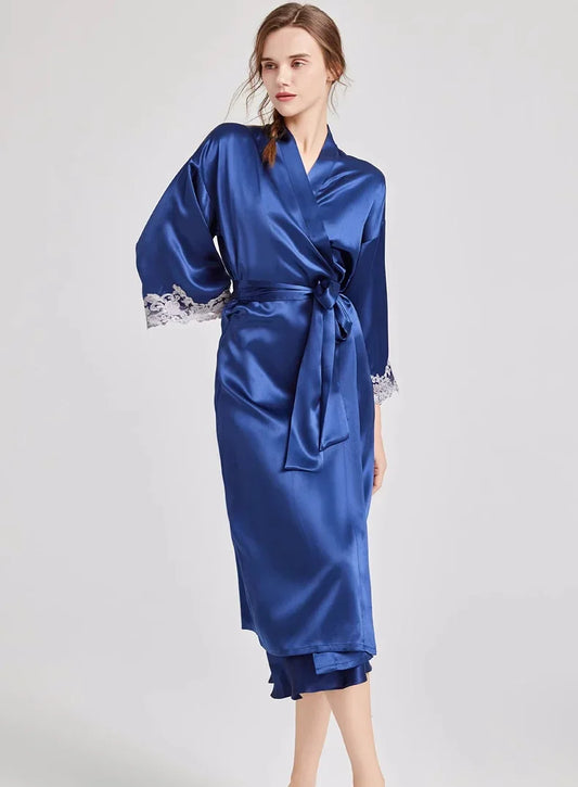100% Mulberry Silk Robe Gown Sleepwear Sets Lace Trim Women Spring Autumn Leisure Sexy Pyjamas 2 Pieces Bathrobe & Nightdress