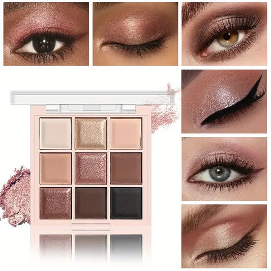 9-color eyeshadow palette, coffee brown & nude metallic tones, matte glitter & metallic finish, smoky makeup, party & stage