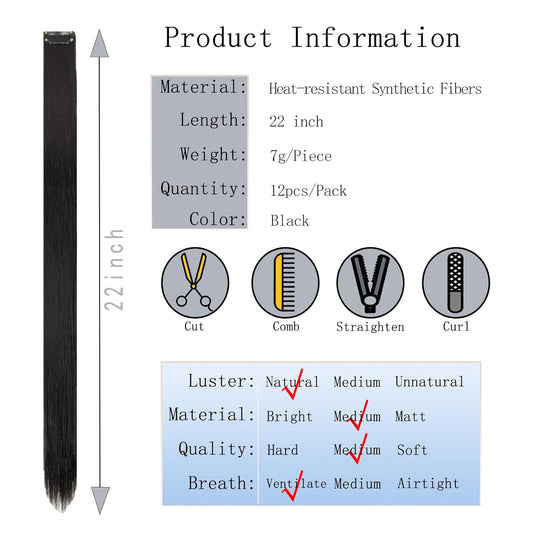 22'' Clip-In Black Hair Extensions - 12 Pieces