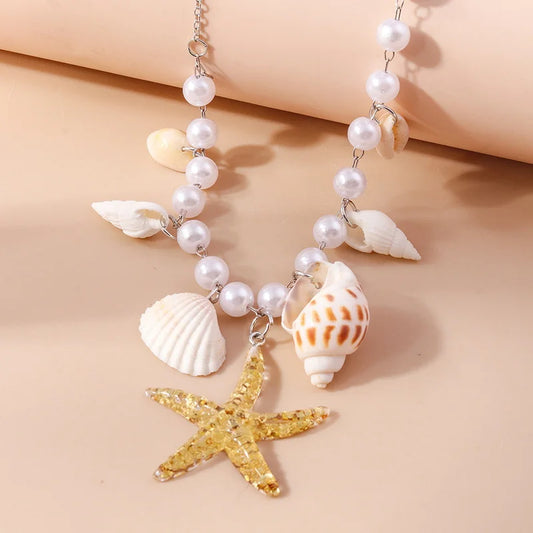 Bohemian Beach Imitation Pearl Starfish Pendant Necklace for Women Girls Conch Shell Bead Choker Necklace Summer Jewelry