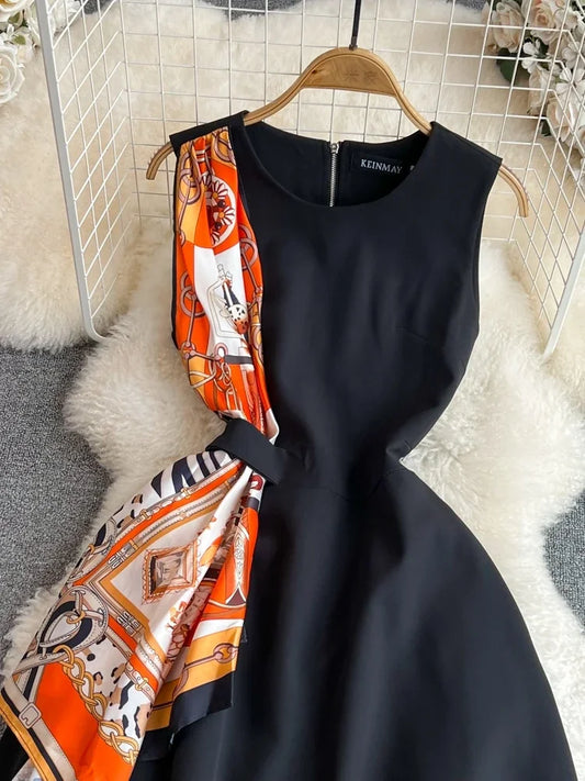 2024 Retro Sleeveless Elegant Black Print Slim Long Dress Formal Party
