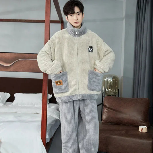 Male Zipper Pajamas Winter Coral Fleece Warm Pajama Sets Thickened Homewear Suit Men Thermal Flannel Sleepwear Turtleneck Lounge
