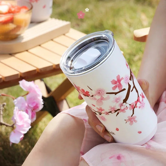 360/560ml Thermos Mug Leak-Proof Travel Ins Cherry Blossom Style Stainless Steel Double Wall Heat Resistant Tea Water Coffee Cup