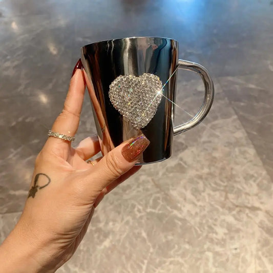 Stainless Steel Coffee Mug with Handle Heart-Shaped Sparkling Water Cup Faux Crystal Coffee & Beer Mug for Hot Beverage Tea
