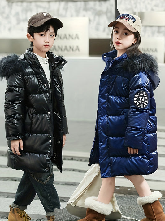 Combinaison de neige en similicuir à capuche en fourrure douce pour filles et garçons, veste longue et épaisse rembourrée en duvet synthétique avec fermeture éclair sur le devant.