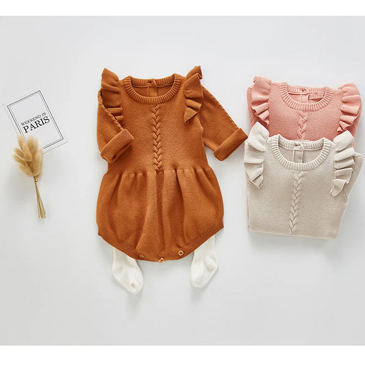 Baby Girls Knitted Bodysuit 2022 Spring Infant Newborn Long Sleeve Solid Ruffled Jumpsuit Outfit Set Baby Spring Autumn Clothing