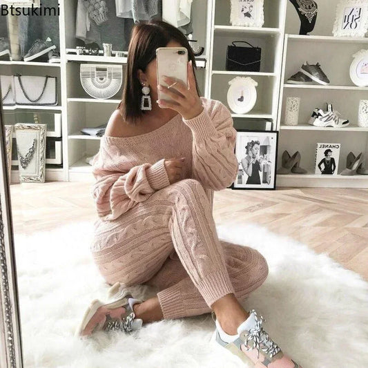 Plus Size 4XL 5XL Womens Outfits Autumn Winter Tracksuit Set Knitted Sweater and Pants Two Piece Set Women Sweater Pants Sets