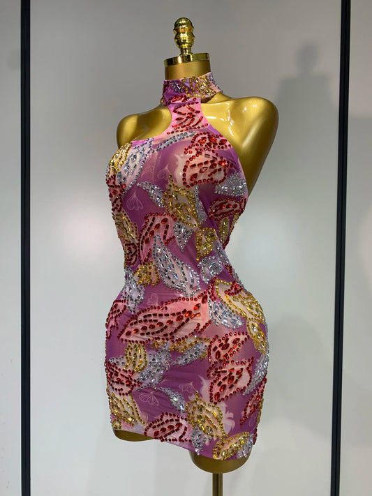 Sparkly Rhinestone Hollow Fishnet Mini Dress