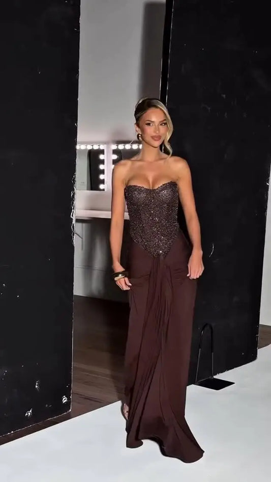 Sexy Sequin Patchwork Strapless Maxi Dress Women Sleeveles Off-shoulder Cinched-waist Pleated Dresses Lady Evening Party Gowns