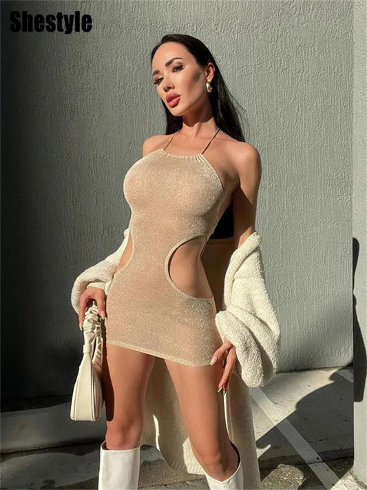 Shestyle Sparkle Halter Sexy Dress Women Sheath Hollow Out Nude Apricot Side Hole Sleeveless Backless Club Party Outitf Hot