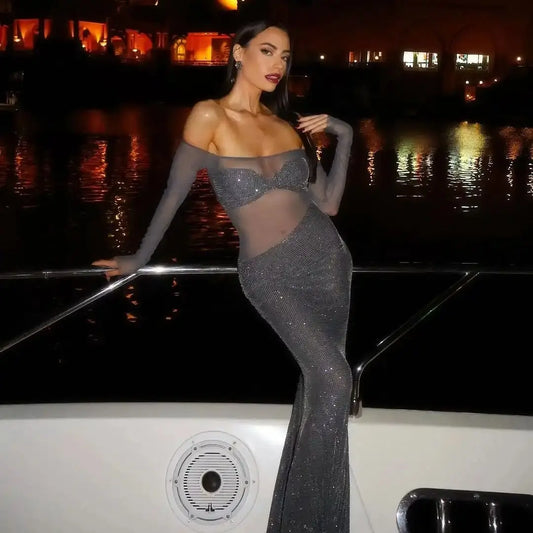 Shining Diamonds Sexy See Through Mesh Off The Shoulder Ankle Length Dress Graceful Woman Party Dress Celebrity Party Outfit