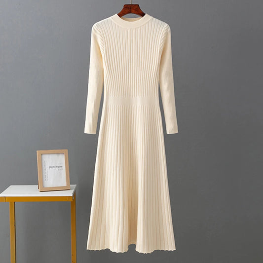 Long Sleeve Party Midi Dress for Women Knitted O Neck Elegant Knitted Sweater Dresses Ladies Slim Waist A-line Knitted Dress