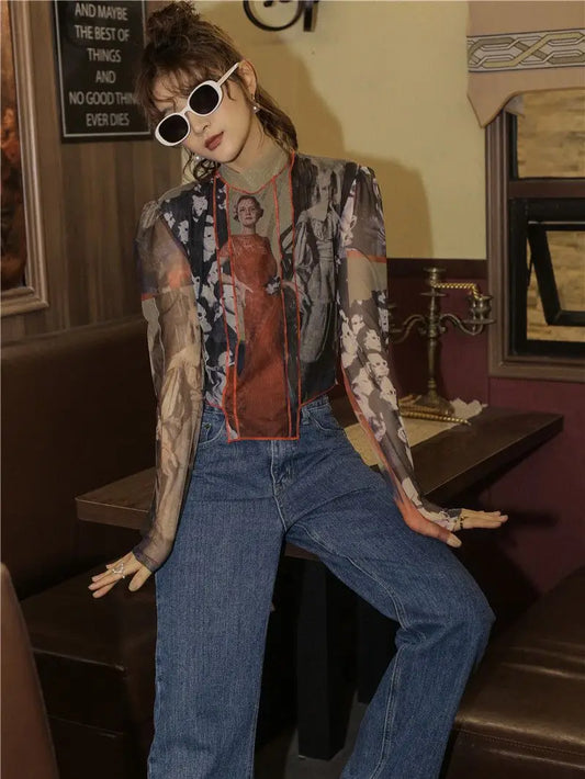 CHEERART Vintage Mesh Top Women Fashion Long Sleeve Blouse Asymmetrical Top And Blouses Patchwork Turtleneck High Neck Top