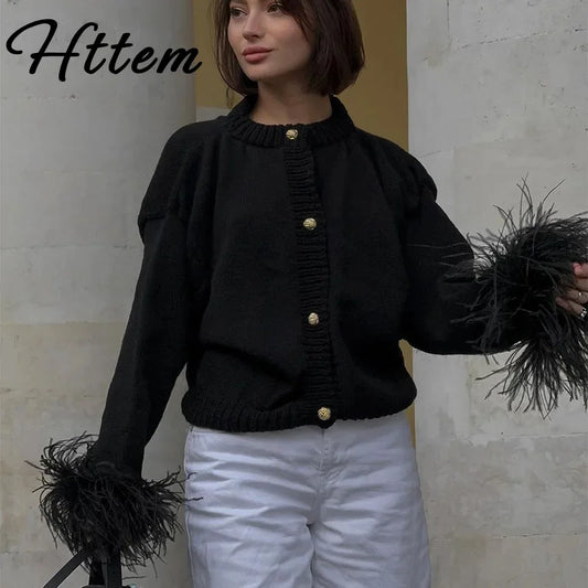 Casual Feather Knitted Cardigan Women Loose Long Sleeve Single Breasted Patchwork Sweater 2025 Autumn Lady Street Knitwear