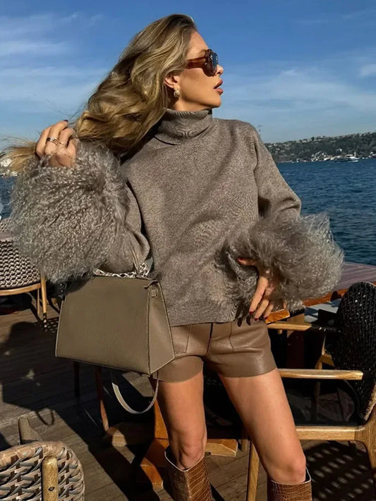 Women's Fur Patchwork Knit Sweater Fashion High Neck Long Sleeve Loose Fit Pullover Lady New Autumn Street Wear Sweaters