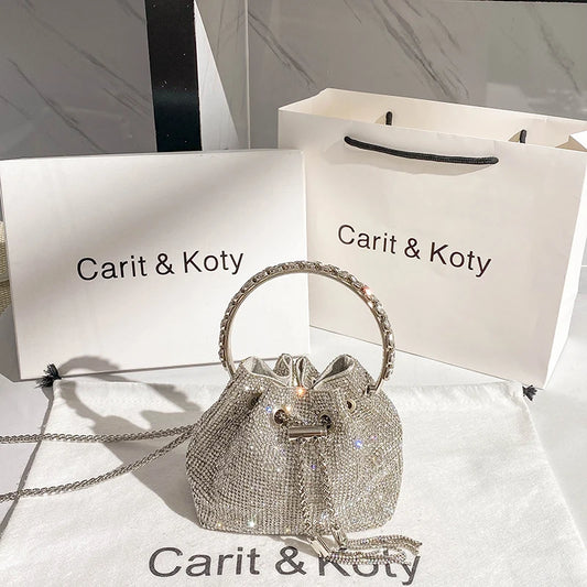 Rhinestones Diamond Evening Clutch Bag Luxury Designer Metal Ring Women's Handbag Wedding Party Bling Bucket Purse Shoulder Bag