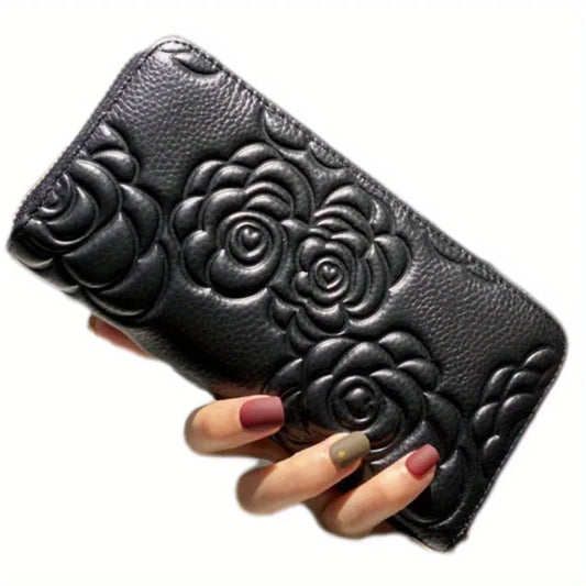 Chic Retro Flower Embossed Long Wallet - Quilted Clutch Purse with Secure Zipper, Detachable Wristlet for Coins & - Solid Color