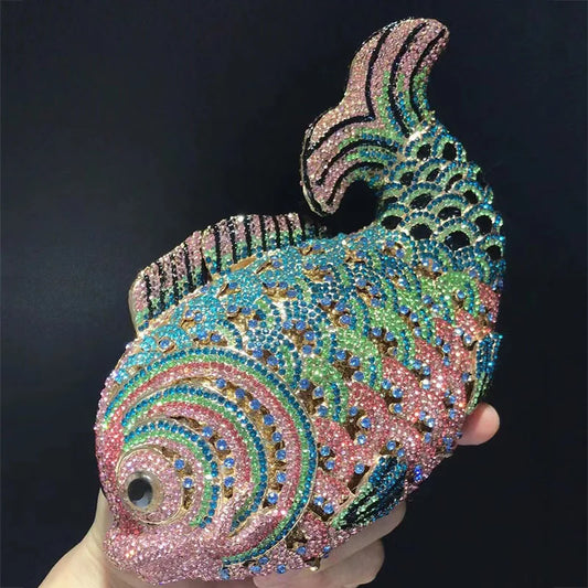 Blue/Green/Black Crystal Women Fish Clutches Luxury Gold Metal Lady Girl Evening Shoulder Handbag Elegant Banquet Wedding Purse