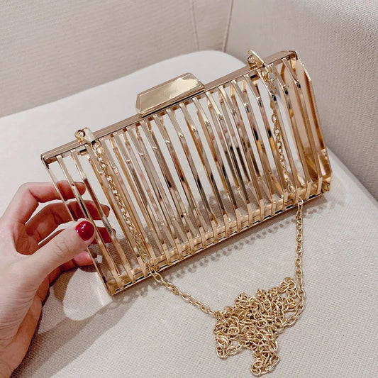 Gold Women Chain Crossbody Bags Iron Cage Metal Hollow Out Evening Clutch Purse Women Party Wedding Handbags Prom Luxury Bolso