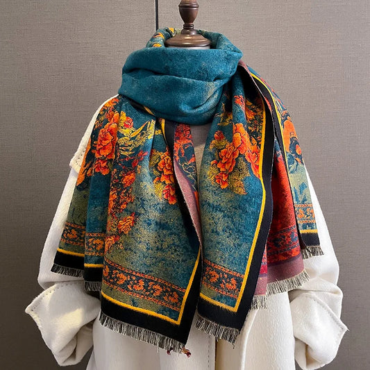 High Quality Elegant Double Sided Pashmina Scarf Blanket Shawls Wrap Winter Thick Women Peacock Flowers Print Cashmere Scarves