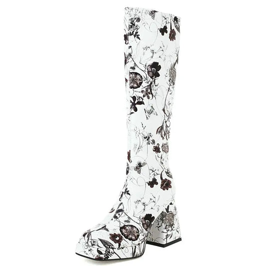 2021 Women Knee High Boots Platform Thick High Heel Ladies Calf Boots PU Leather Embroider Square Toe Women's Boots White Green