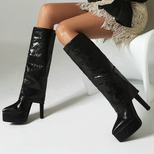 Women Knee High Boots Platform Square High Heel Ladies Calf Boots Sequined Cloth Slip on Dress Women's Boots Gold Silver