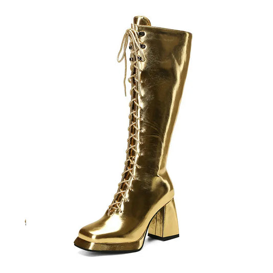 Gold Silver 2024 Women Knee High Boots Platform Thick High Heel Ladies Calf Boots PU Leather Square Toe Cross Tied Women's Boots
