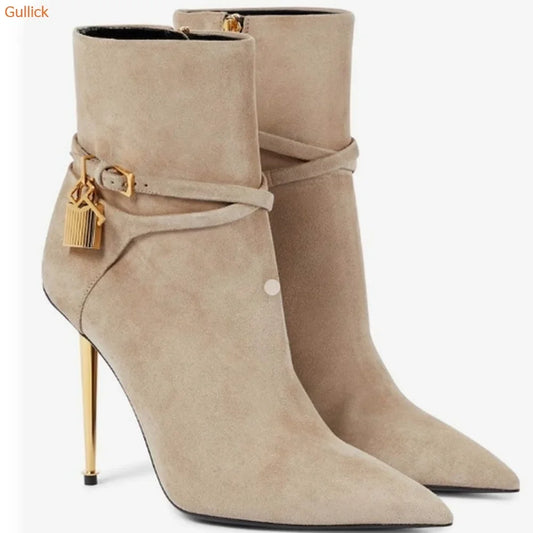 Solid Color Pointed Toe Ankle Boots Gold Lock Metal Heel Stiletto Heel 10CM Women Patent Leather Suede Short Boots 44 SIZE