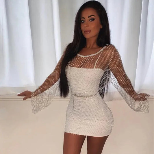 Sparkly Rhinestone Hollow Fishnet Mini Dress