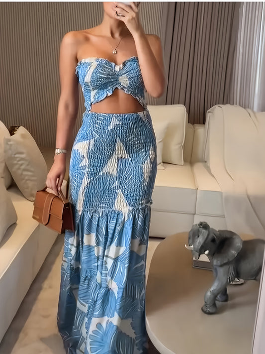 Print Off-Shoulder Maxi Skirt and Strapless Top Set - Elegant Blue Floral Print Two-Piece Outfit for Women, Perfect for Spring/Summer, Stylish Attire|Trendy Women'S Wear|Subtle Pattern
