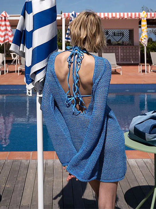 New Knitted Loose Dolman Sleeves Sexy Backless Beach Skirts Pool Party Bikini Cover Up Hollow Out Blouse Womens Swimwear A1886