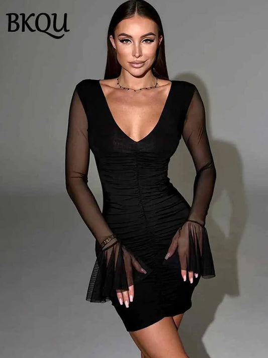BKQU Sexy V-neck Ruched Mini Bodycon Dress Women's Summer Mesh Patchwork Long Flare Sleeve Elegant Night Club Short Dress 2025