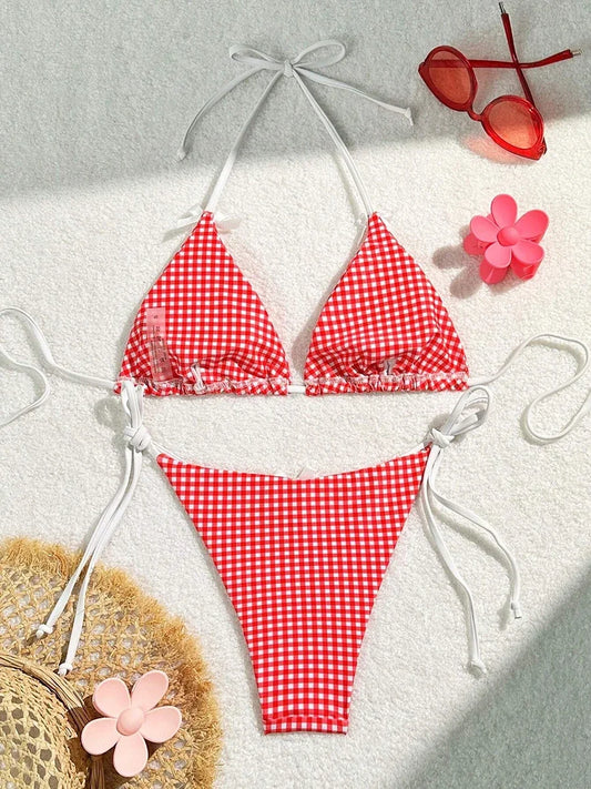 Sexy Bikini 2025 Swimwear Women's Swimsuit Butterfly Decor Checked Halter Neck Thong Bikinis Sets Summer Beachwear Bathing Suits