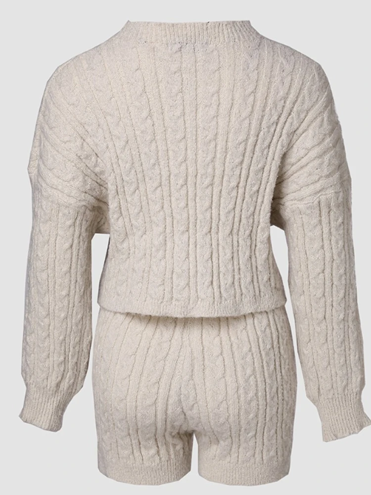 2 Piece Set Round Neck Long Sleeve Knit Crop Sweater High Waist Shorts Tracksuits Outfits