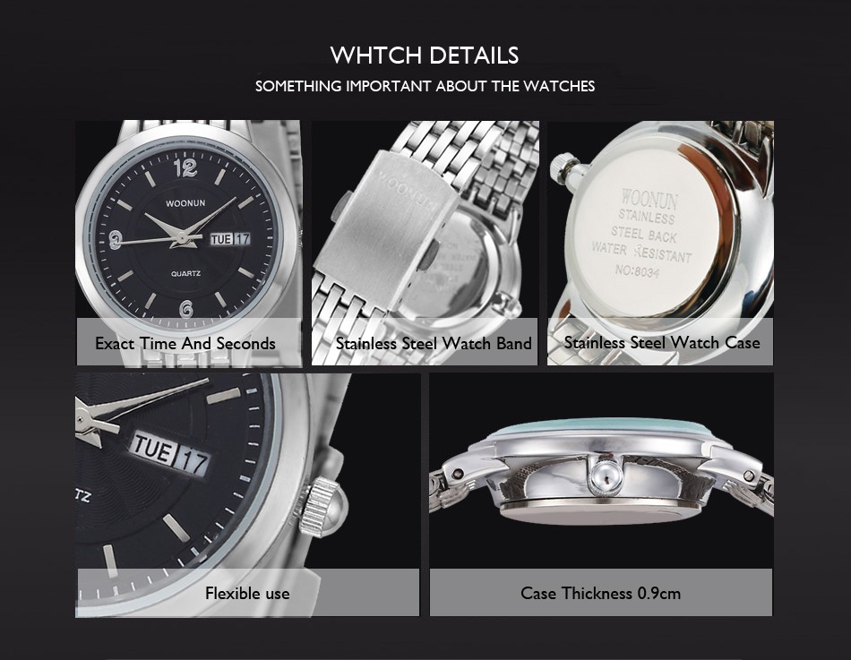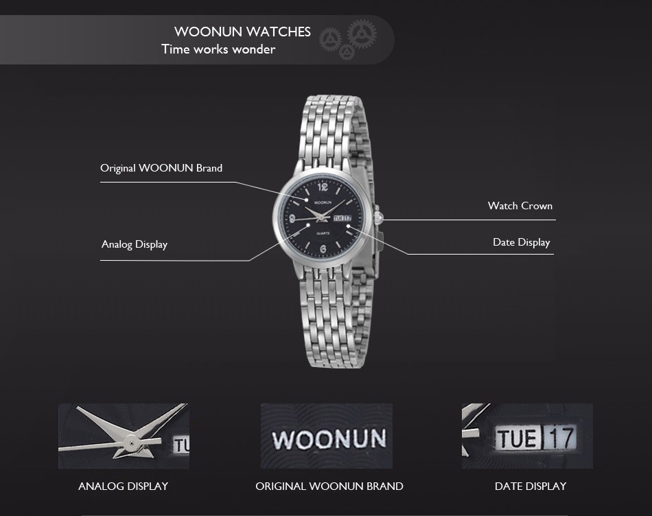 - Stainless steel band & backcase with Woonun logo;
