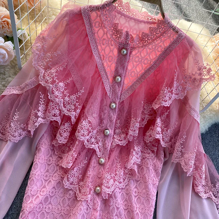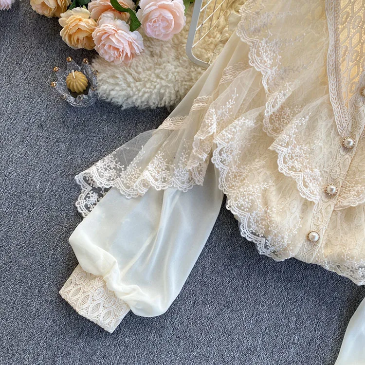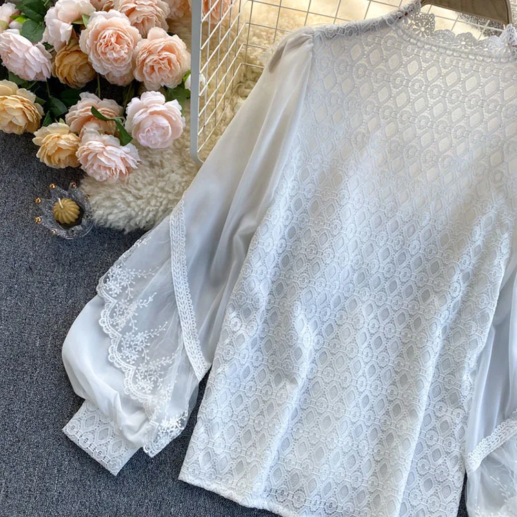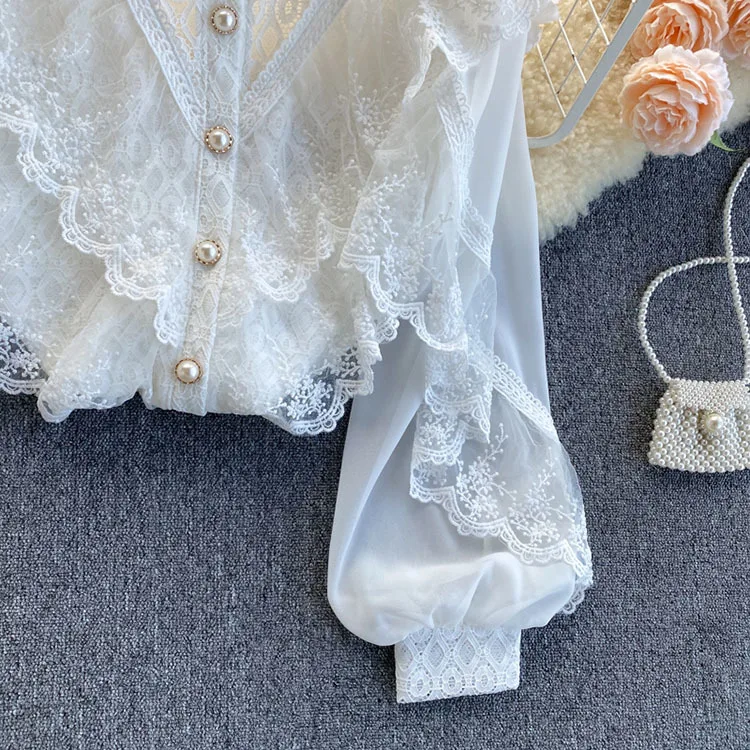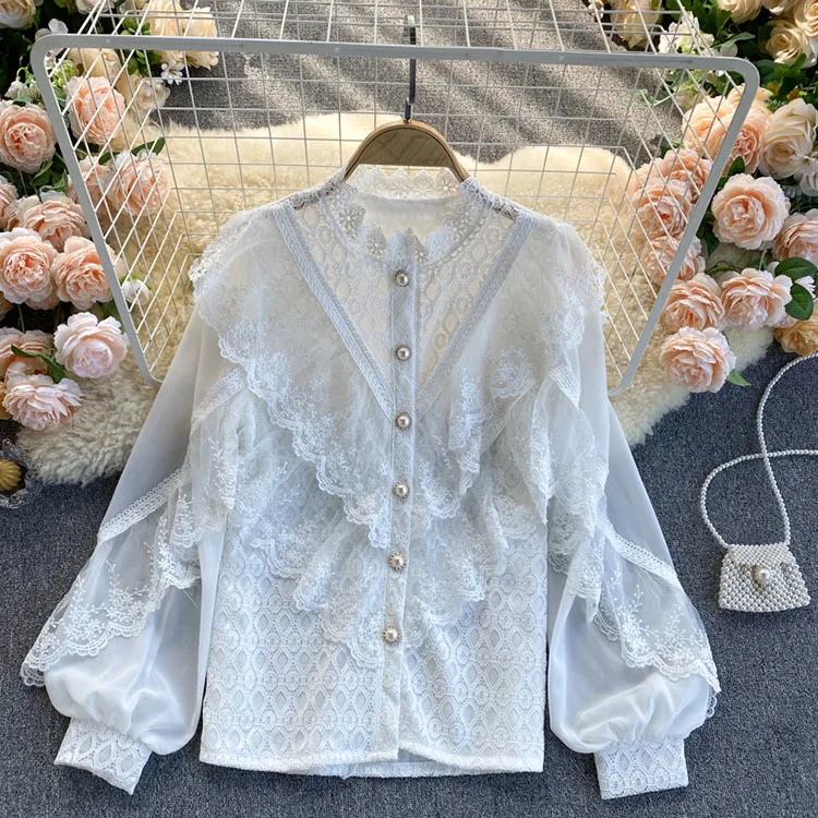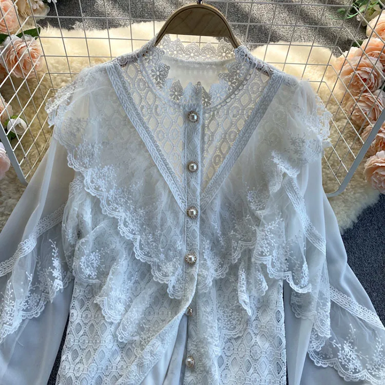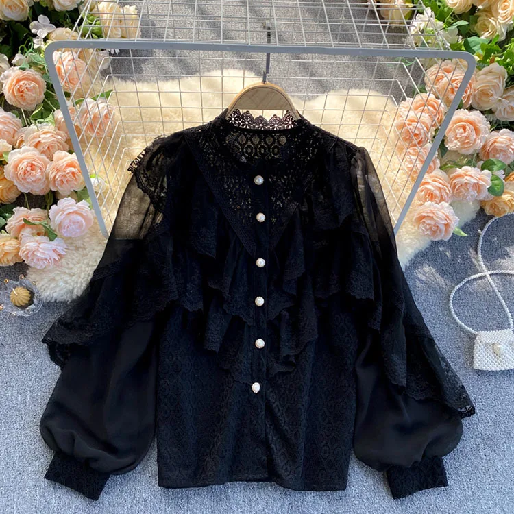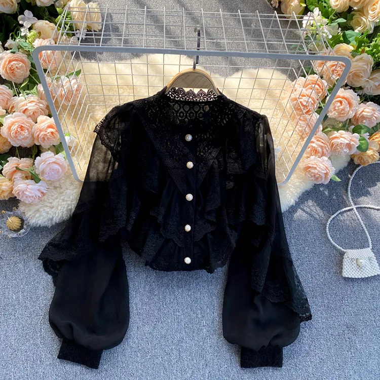 2022 New Spring Shirts Solid Ruffles Lace Patchwork Elegant Women Blouses Tops Puff Sleeve Single Breasted Blusas
