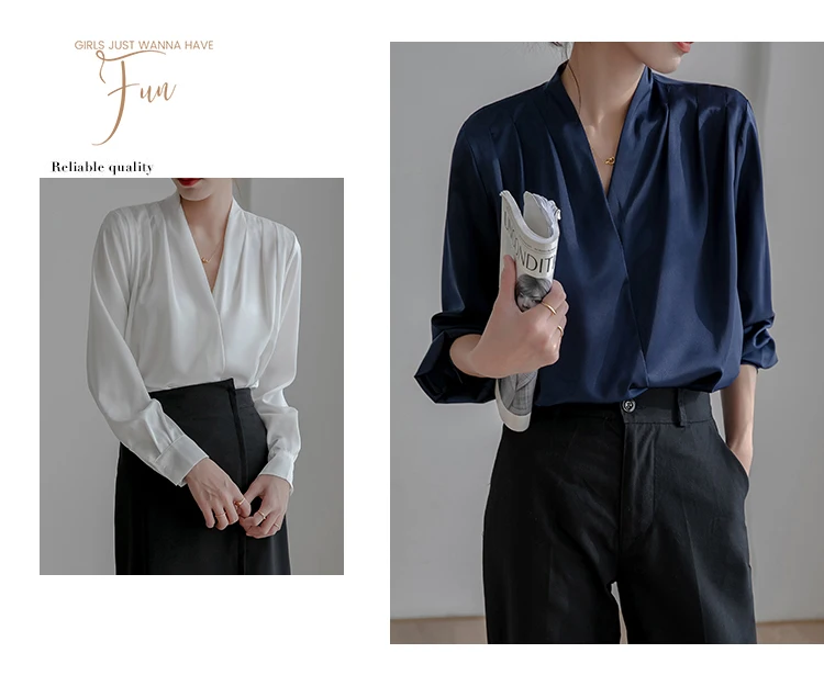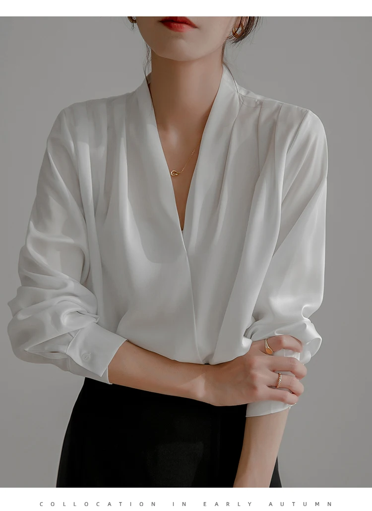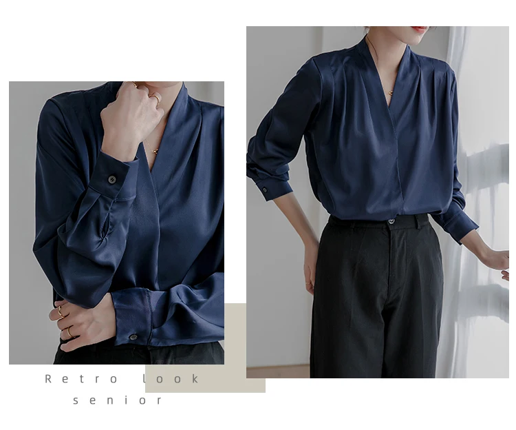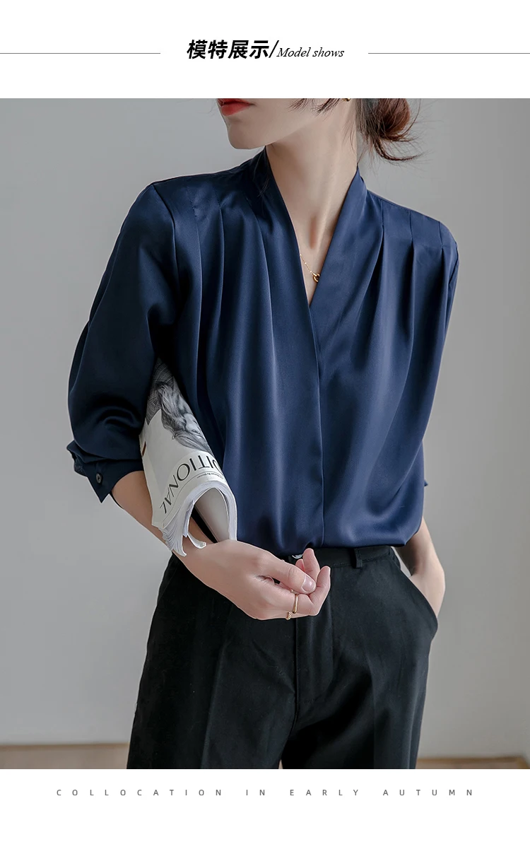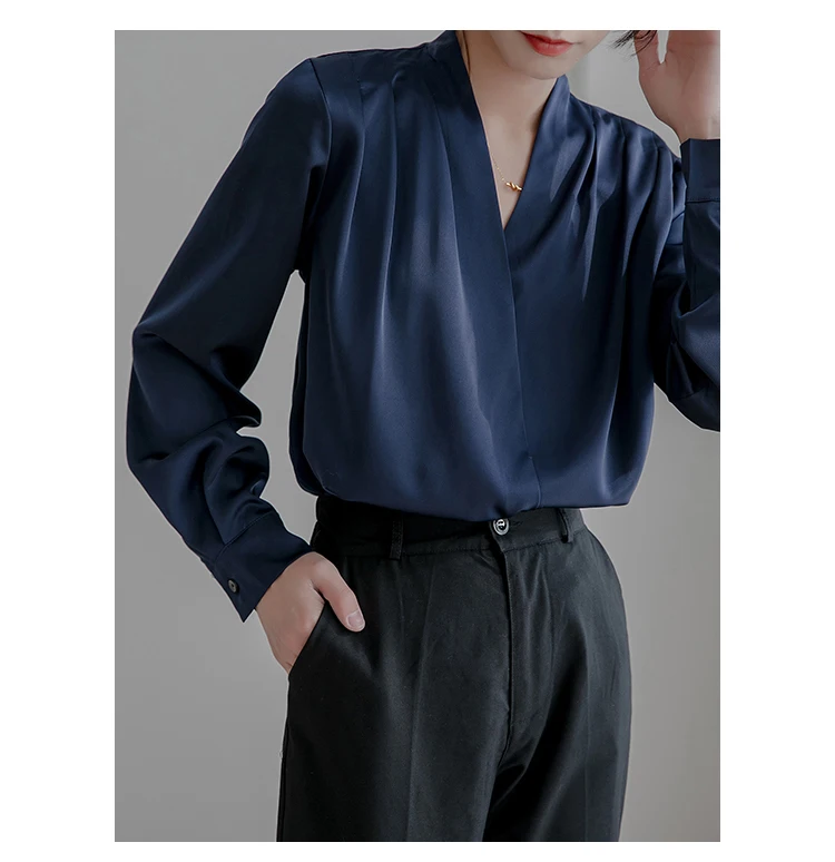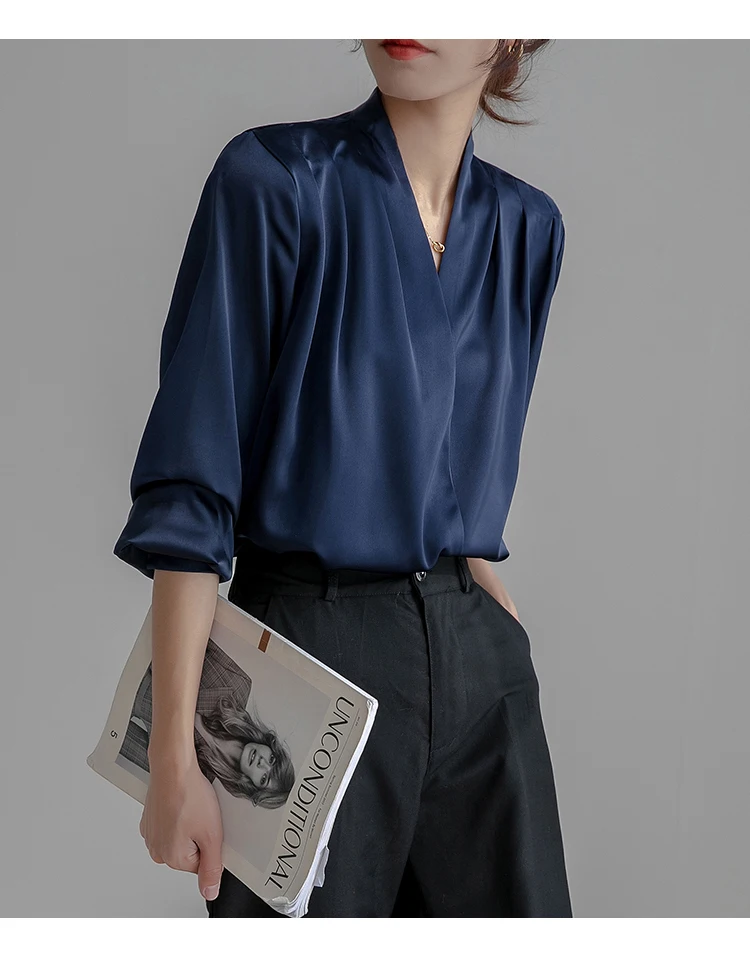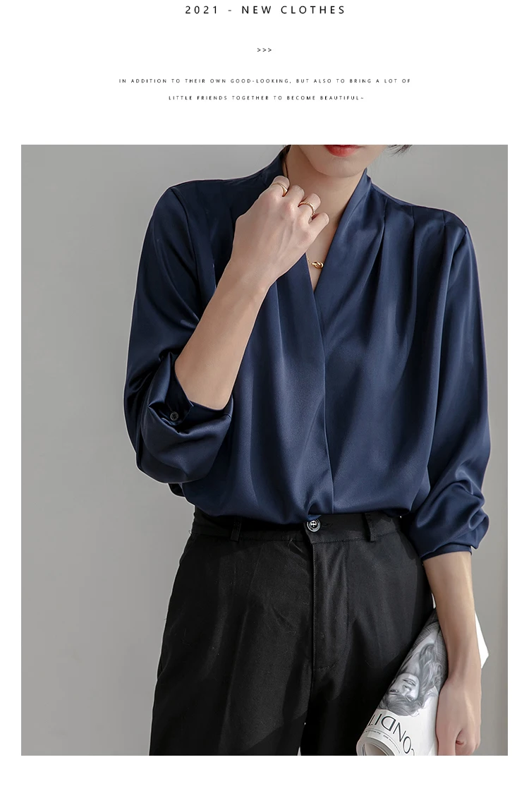 2022 Spring New Arrival Women Elegant Satin Blouse Lantern Sleeve V-Neck Office Navy Shirt Vintage Autumn Casual Tops T24401X