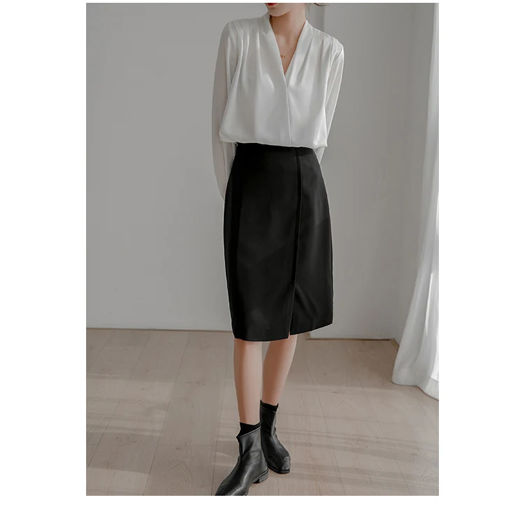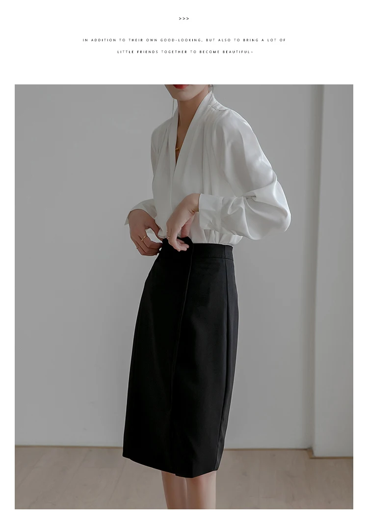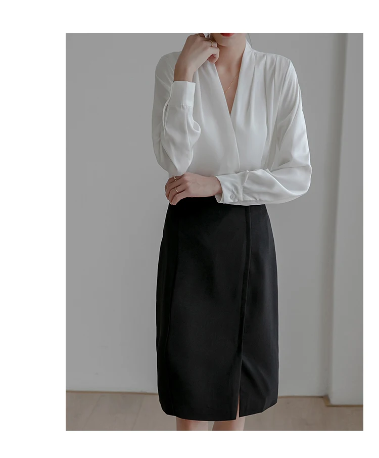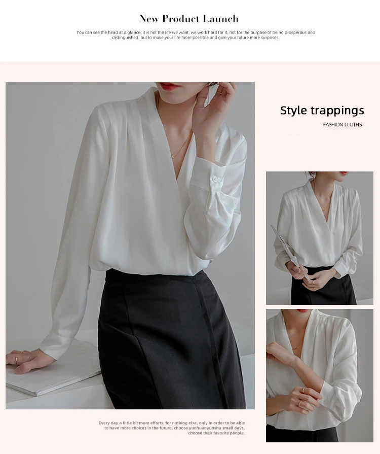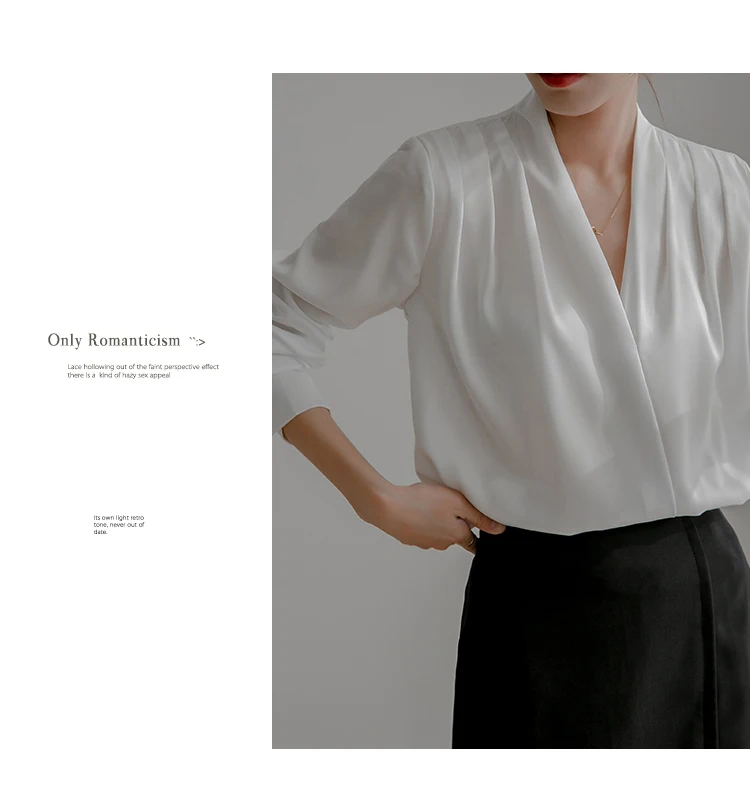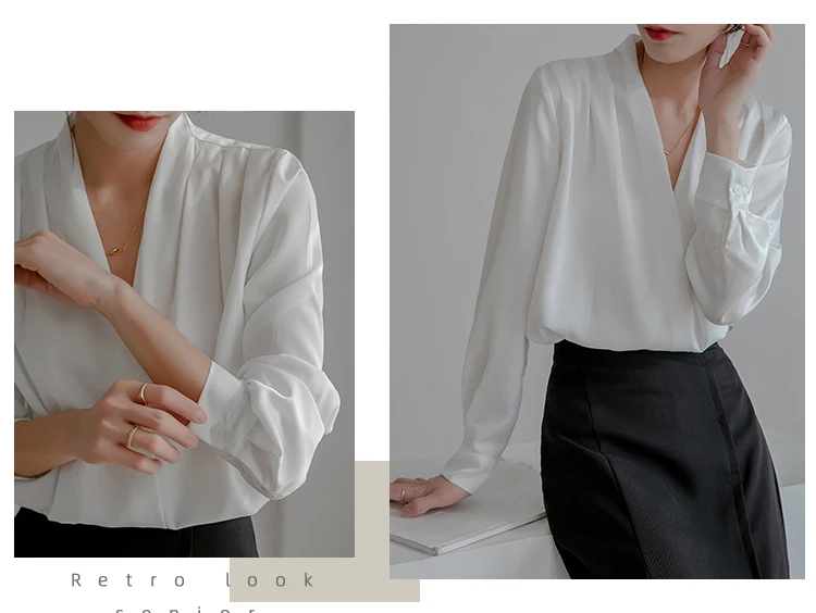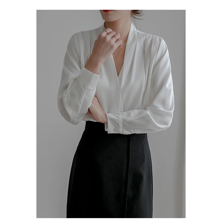 2022 Spring New Arrival Women Elegant Satin Blouse Lantern Sleeve V-Neck Office Navy Shirt Vintage Autumn Casual Tops T24401X