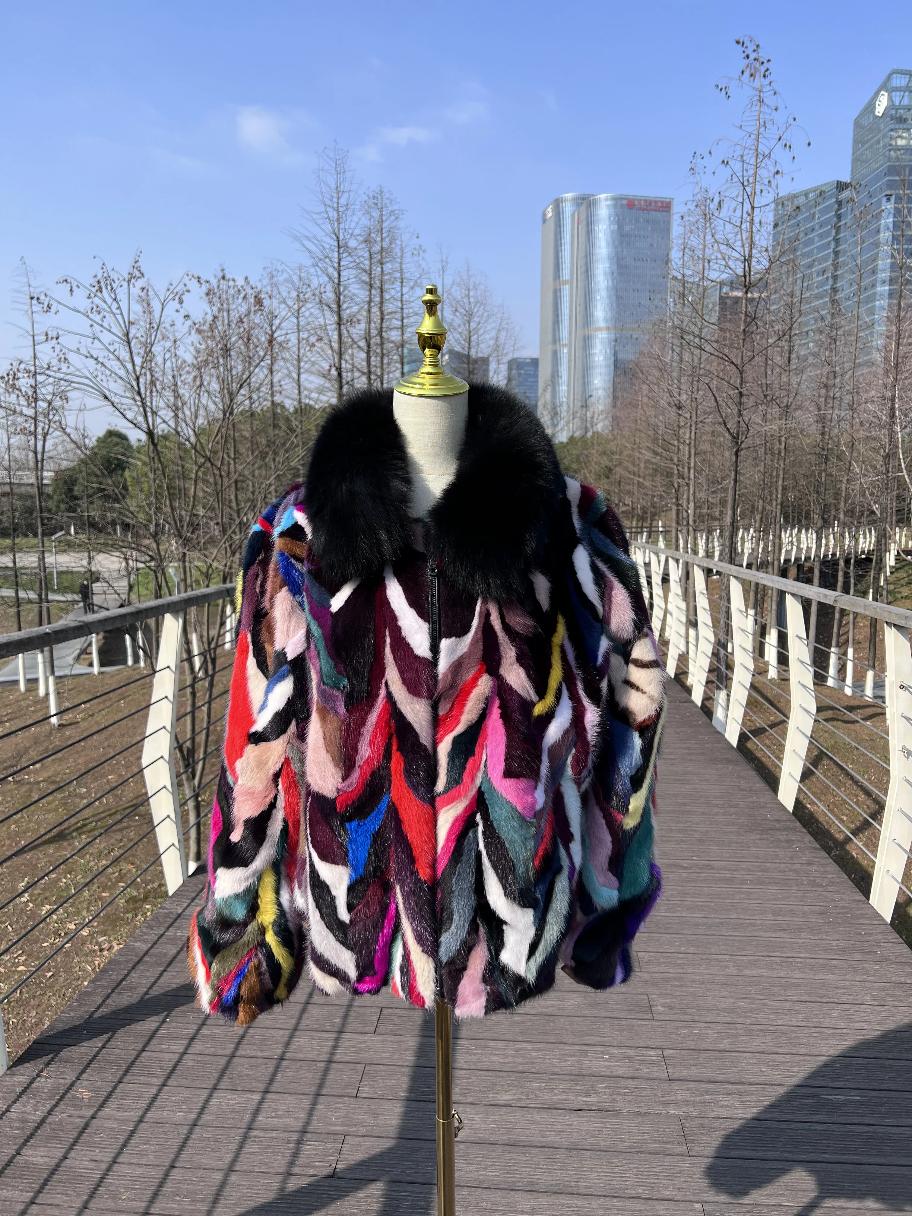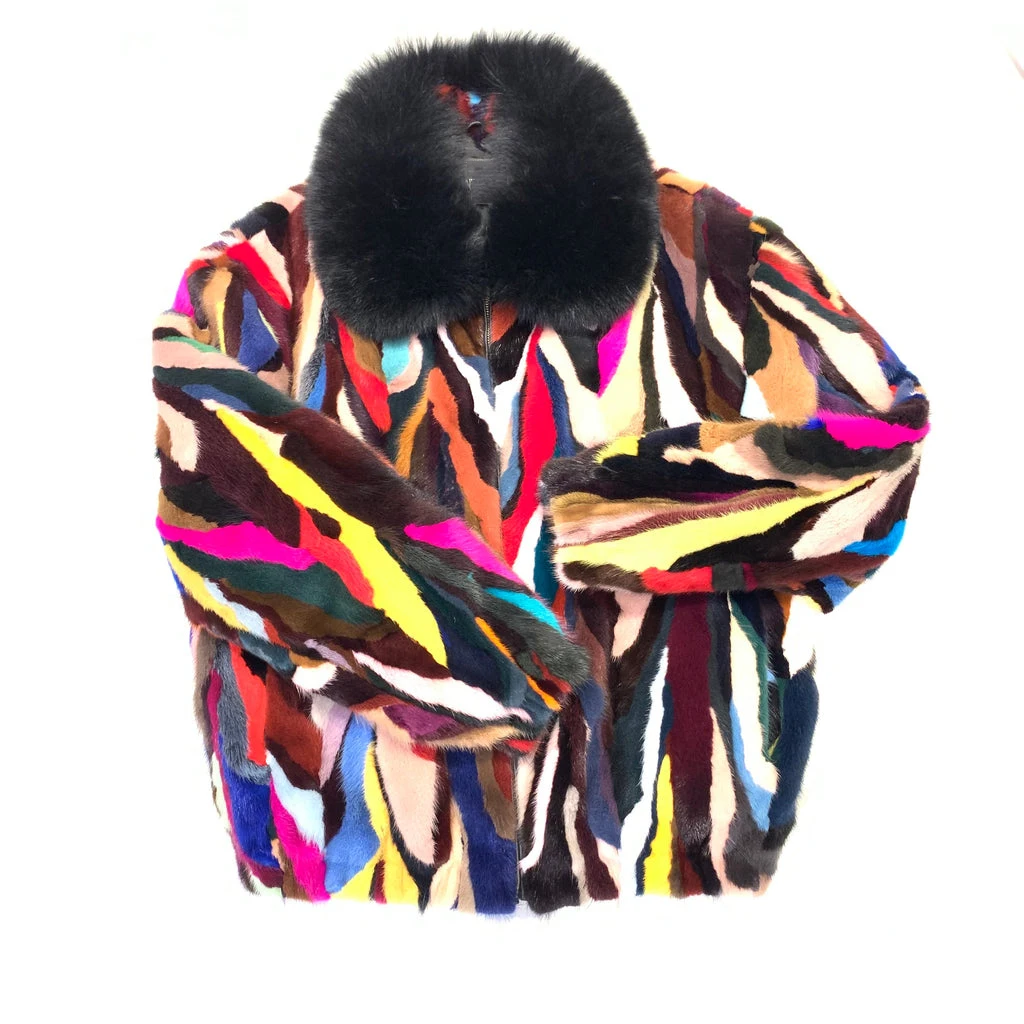 2025 Father's Day Present Real Mink Fur Coat Patchwork Jacket Winter Multicolor Mink Fox Fur Collar Bomber Coat