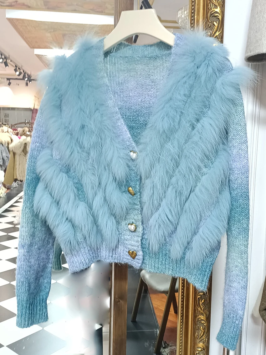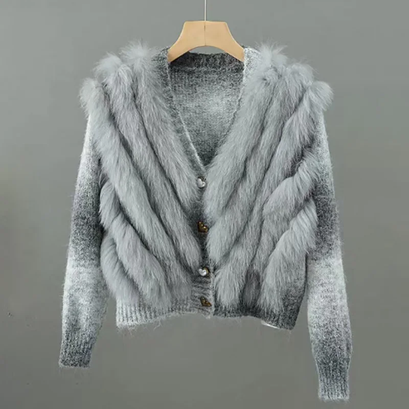 2025 Women Autumn Short Fur Trim Knitted Cardigans With Button Real Fox Fur Fur Striped Coat Outwear Female Sweater With Fur