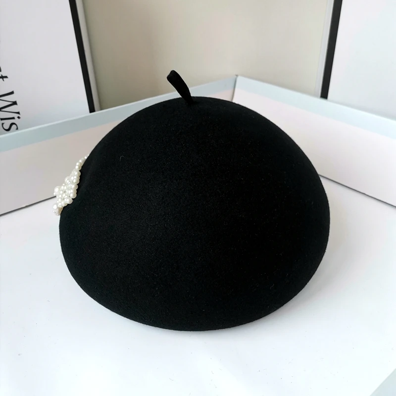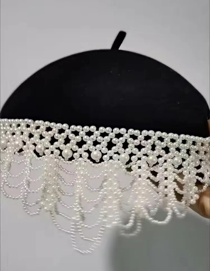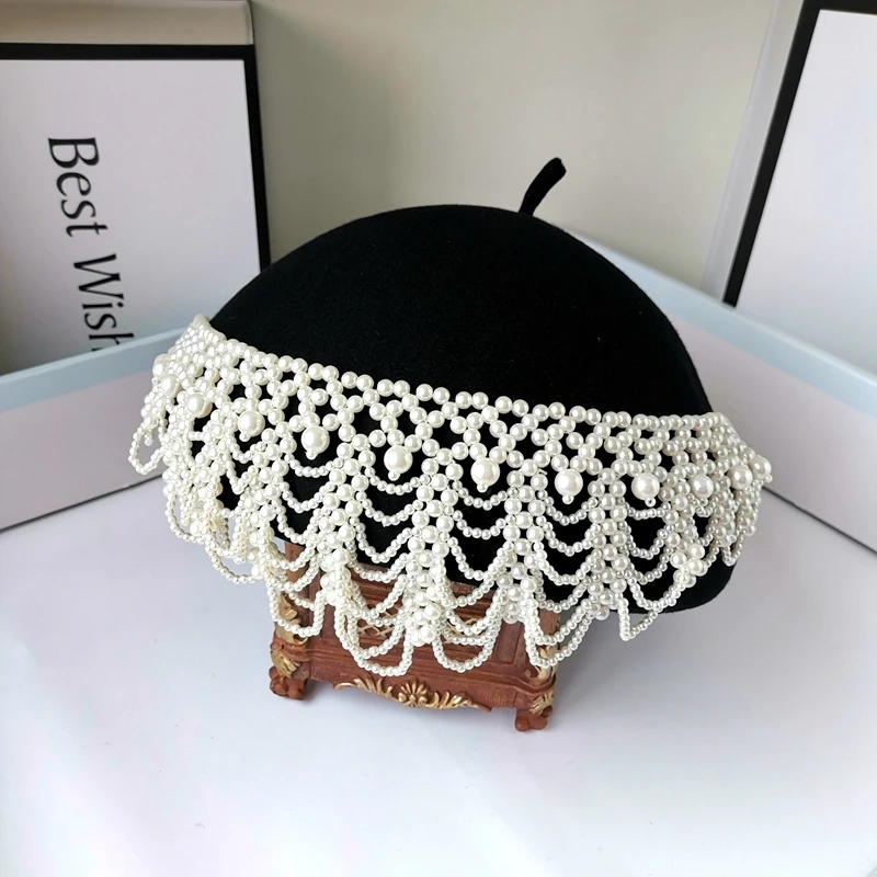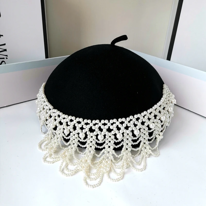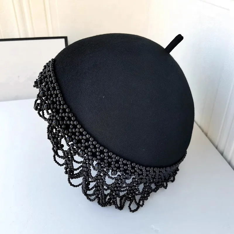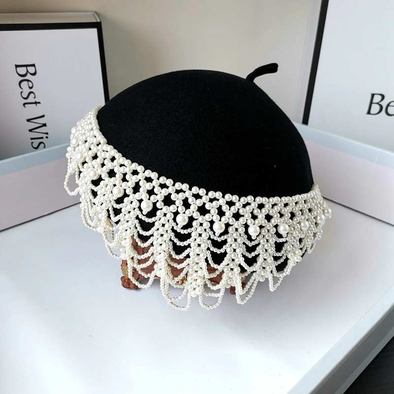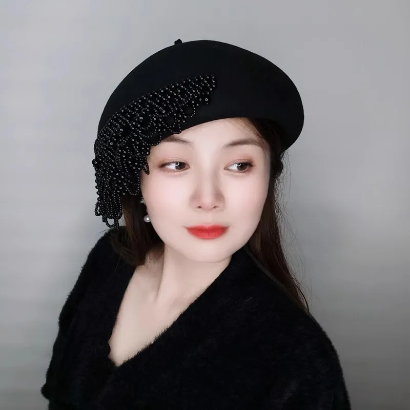 202508-shi chic dropshipping design wool Tassel pearl chain Elegant retro lady beret hat women painter hat