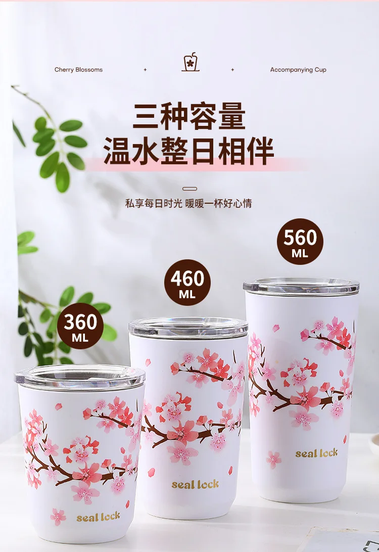 360/560ml Thermos Mug Leak-Proof Travel Ins Cherry Blossom Style Stainless Steel Double Wall Heat Resistant Tea Water Coffee Cup